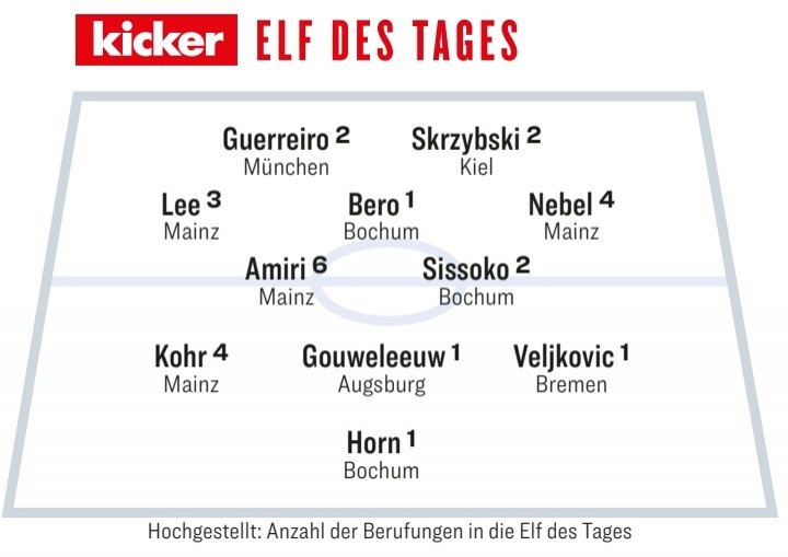 中場:李在城(美因茨)、阿米里(美因茨)、馬圖斯-貝羅(波鴻)、易卜拉希馬-西索科(波鴻)、內(nèi)布爾(美因茨)