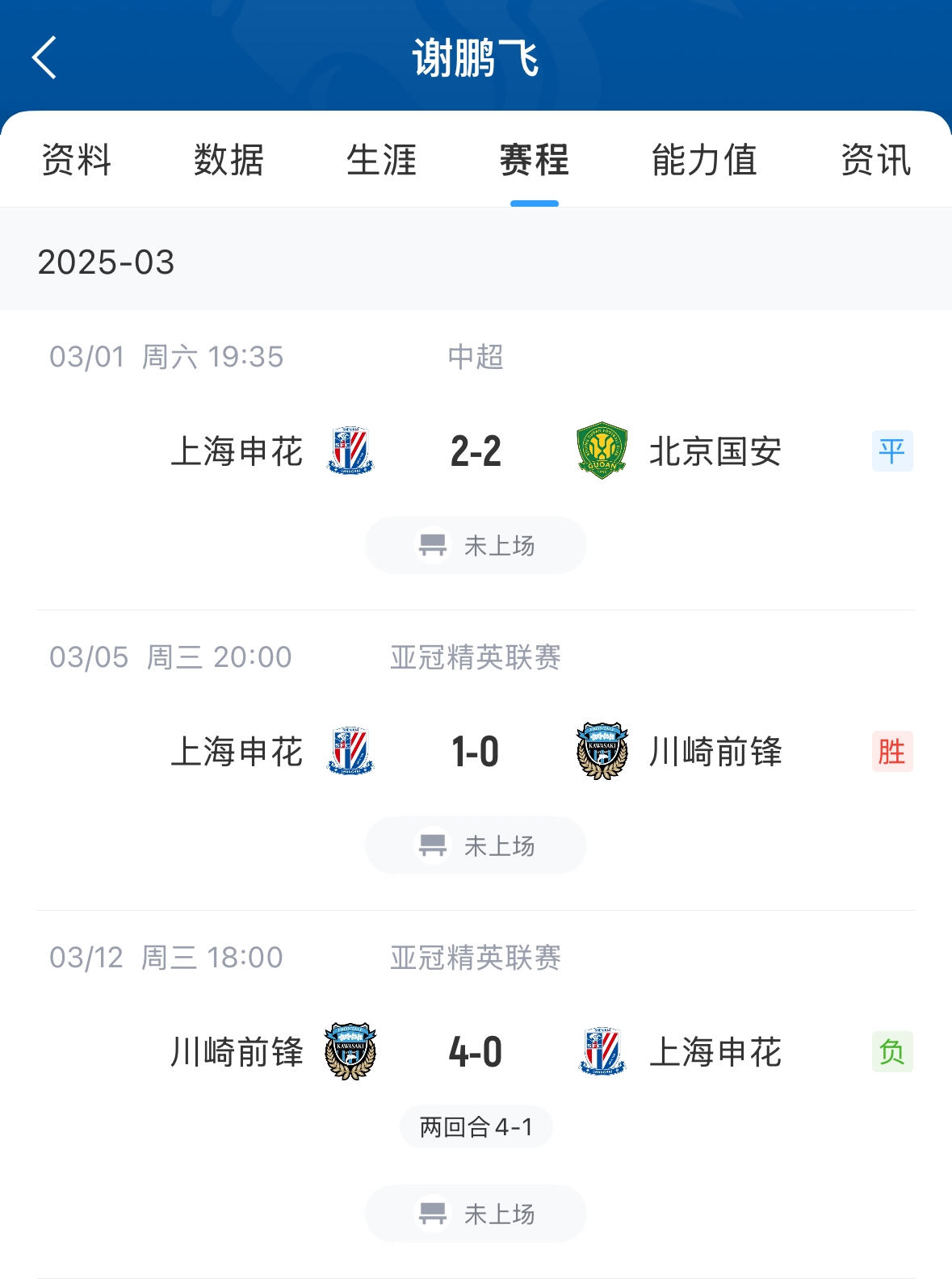 謝鵬飛本場(chǎng)比賽替補(bǔ)未出場(chǎng),謝鵬飛今年6月底滿32歲,本賽季目前代表申花只出場(chǎng)1次出場(chǎng)時(shí)間26分鐘,其余幾場(chǎng)比賽均未出場(chǎng)。