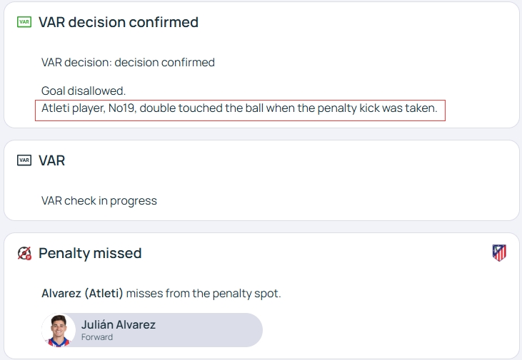 歐冠官網(wǎng)對此的解釋為:VAR判決確定,進(jìn)球無效。馬競19號(hào)球員(阿爾瓦雷斯),罰點(diǎn)時(shí)兩次觸球。