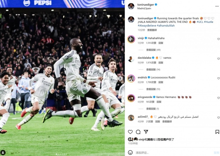 本場比賽呂迪格打進(jìn)致勝點(diǎn)球,賽后他也在個人社媒曬出全隊瘋狂慶祝照,配文寫道:“沖向歐冠8強(qiáng),Hala Madrid,永遠(yuǎn)堅持到最后一刻!”