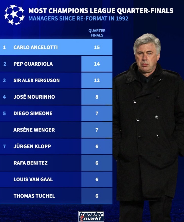 德轉(zhuǎn)也盤點了歐冠改制后主帥率領(lǐng)球隊晉級8強的次數(shù)榜,其中安切洛蒂居首。具體如下: