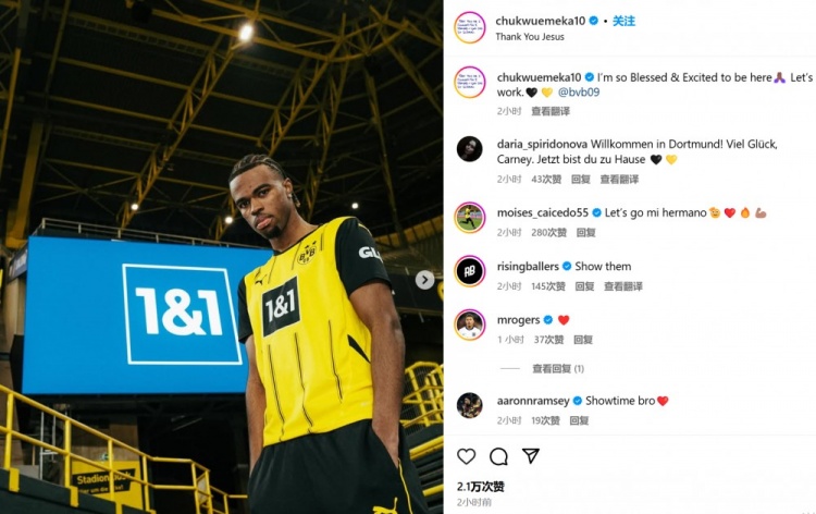 楚克烏梅卡通過社媒曬出自己身穿多特球衣現(xiàn)身威斯特法倫球場的照片,并表示:“能夠來到這里,我感到非常榮幸與激動。讓我們開始努力吧!@多特蒙德俱樂部?!?/p>