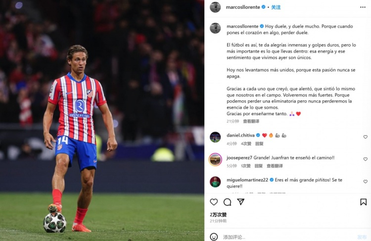 3月14日訊 馬競在本輪歐冠主場被皇馬點球淘汰,出自皇馬青訓的馬科斯-略倫特罰丟點球,他也在今日通過社媒發(fā)文。