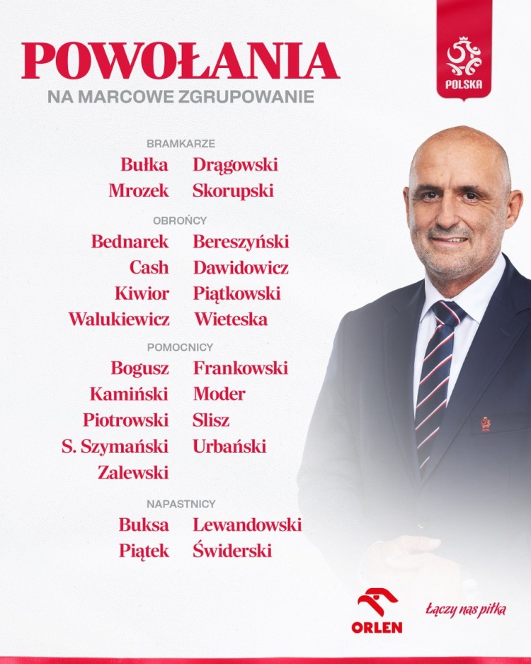 3月14日訊 波蘭最新一期國家隊名單公布,萊萬多夫斯基領(lǐng)銜,扎萊夫斯基、基維奧爾、皮亞特克在列。