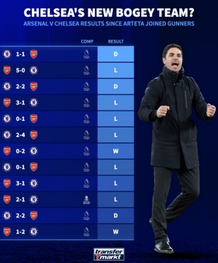 據(jù)統(tǒng)計,在阿爾特塔執(zhí)教阿森納以來,球隊在各項賽事共12次與切爾西交鋒,戰(zhàn)績?yōu)?勝3平2負(fù),其中近6場比賽4勝2平保持不敗。