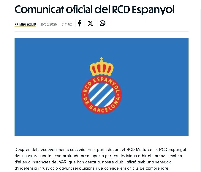 西班牙人足球俱樂部始終對裁判團(tuán)隊(duì)保持有最高尊重,并將繼續(xù)如此,充分認(rèn)可裁判工作的復(fù)雜性與責(zé)任重大性。然而,俱樂部認(rèn)為這種尊重應(yīng)當(dāng)是相互的,應(yīng)該體現(xiàn)在對百年俱樂部、球員、教練團(tuán)隊(duì)和球迷的公平對待上。