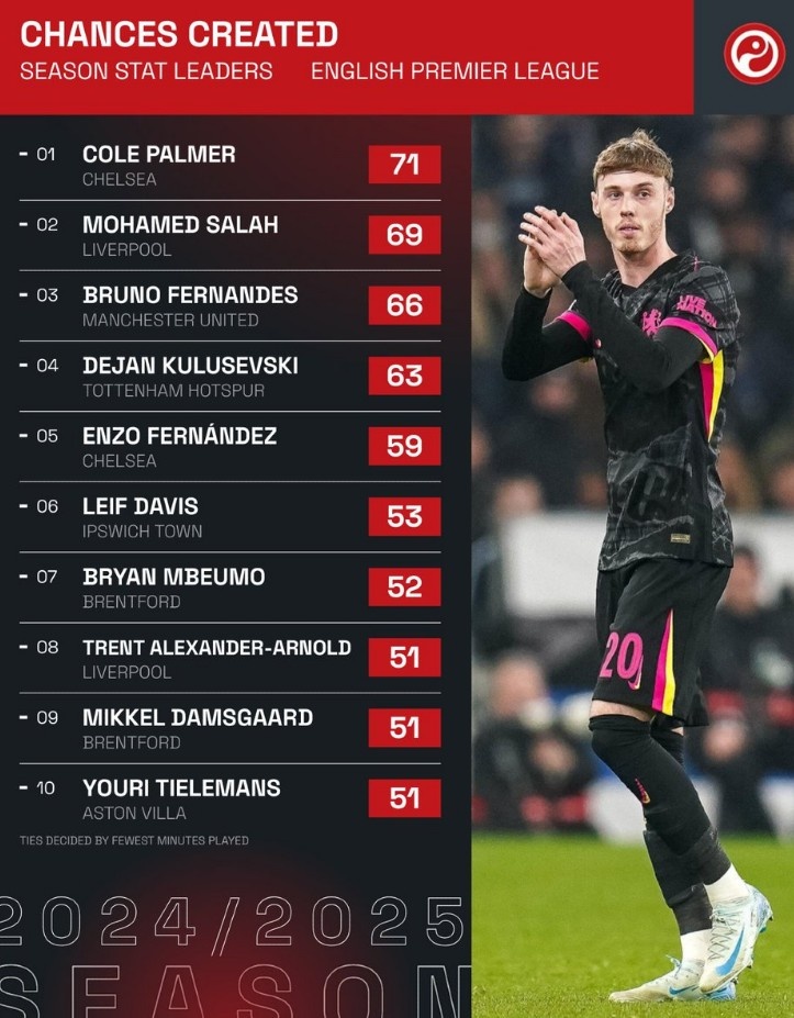 3月17日訊 數(shù)據(jù)網(wǎng)站Squawka盤點了本賽季英超創(chuàng)造機會榜,其中帕爾默以71次居首,不過他自去年12月對陣維拉之后還沒有送出過助攻。具體創(chuàng)造機會榜如下: