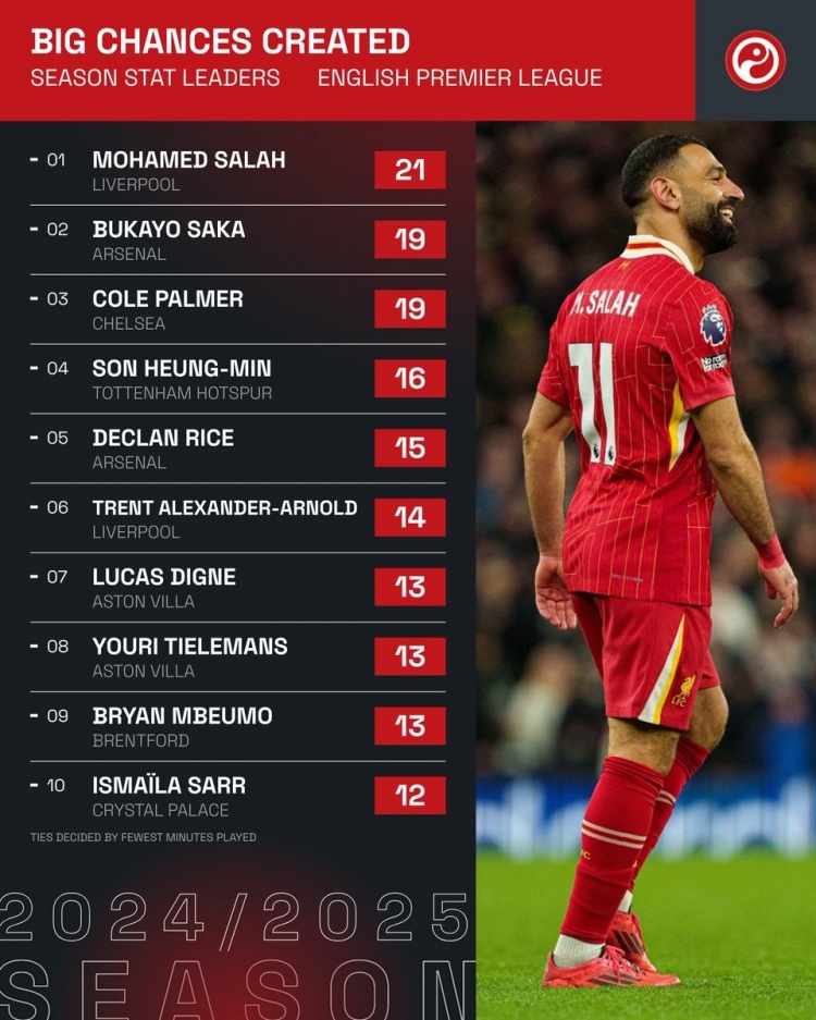 本賽季英超創(chuàng)造重大機(jī)會(huì)榜: