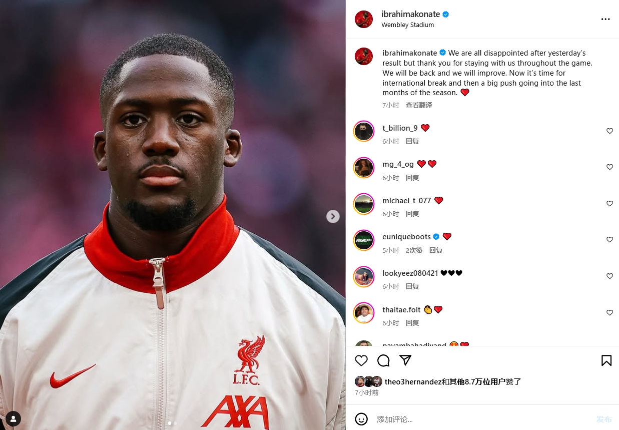 利物浦中衛(wèi)科納特在社交媒體上寫(xiě)道:“昨天的比賽結(jié)果讓我們都很失望,但感謝大家整場(chǎng)比賽都與我們同在?!?/p>