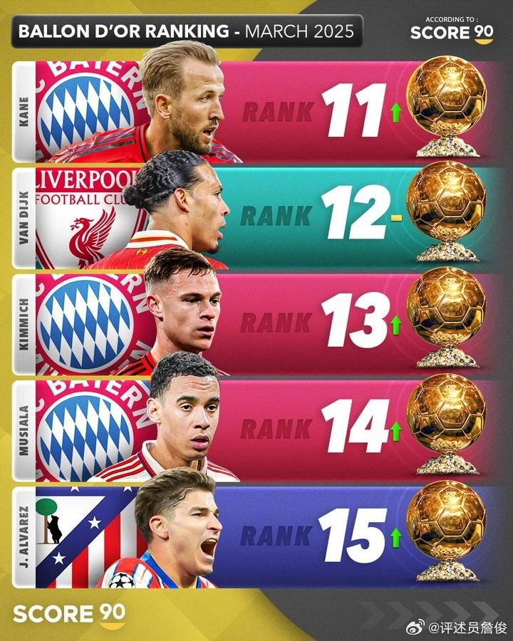 詹俊說:國外網(wǎng)站評(píng)分系統(tǒng)中2025年金球獎(jiǎng)熱門人選前十五名。本季已經(jīng)打進(jìn)30球迎來個(gè)人職業(yè)生涯巔峰的登貝萊,會(huì)不會(huì)是“黑馬”?如果大巴黎本季歐冠最終捧杯的話……