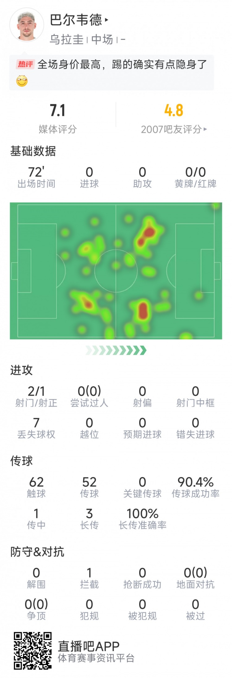 3月22日訊 在本輪南美區(qū)世預賽,烏拉圭0-1不敵阿根廷。巴爾韋德首發(fā)出場被提前換下,以下為他在本場數據: