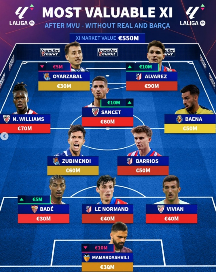 3月22日訊 德轉(zhuǎn)更新了西甲球員身價,并盤點了除皇馬、巴薩球員之外的西甲最貴陣容,其中阿爾瓦雷斯領銜馬競3人在列,具體如下: