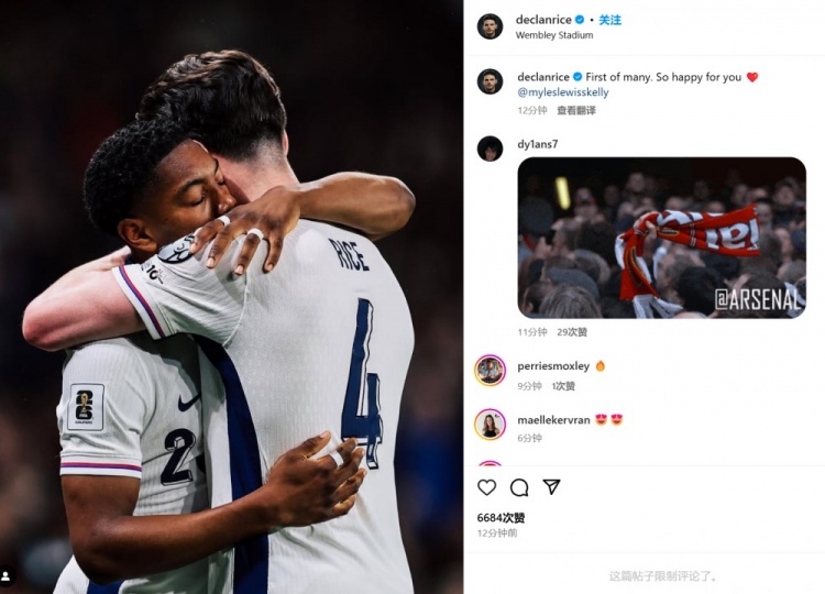 作為雙料隊(duì)友的老大哥賴斯也在賽后通過(guò)社媒曬出兩人的擁抱照,并配文:“未來(lái)眾多進(jìn)球里的第一個(gè)!我為你感到非常開心??@斯凱利”。