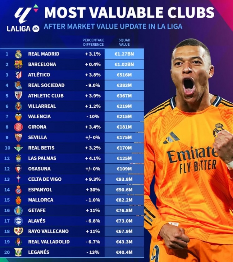 西甲最新球隊(duì)身價(jià)榜:歐元