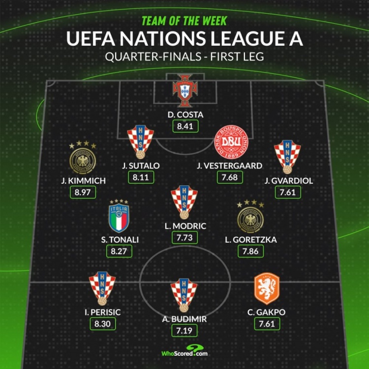 3月21日訊 歐國聯(lián)A級別八強戰(zhàn)首回合已經完賽,whoscored也列出了本輪評分最佳陣容,克羅地亞5將在列。