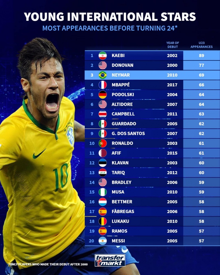 3月23日訊 德國轉會市場統(tǒng)計球員24歲之前在國家隊的出場次數(shù),并列出榜單,內(nèi)馬爾69場排名第三位,C羅61場,梅西57場。