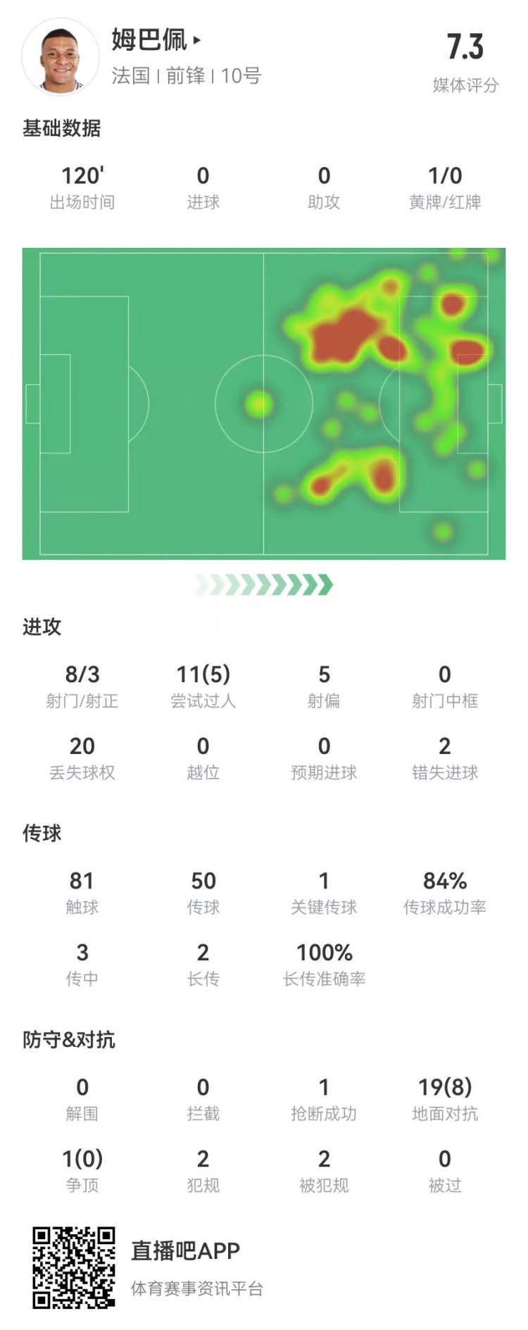 3月24日訊 法國在歐國聯(lián)八強戰(zhàn)次回合再戰(zhàn)克羅地亞,姆巴佩本場數(shù)據(jù)如下: