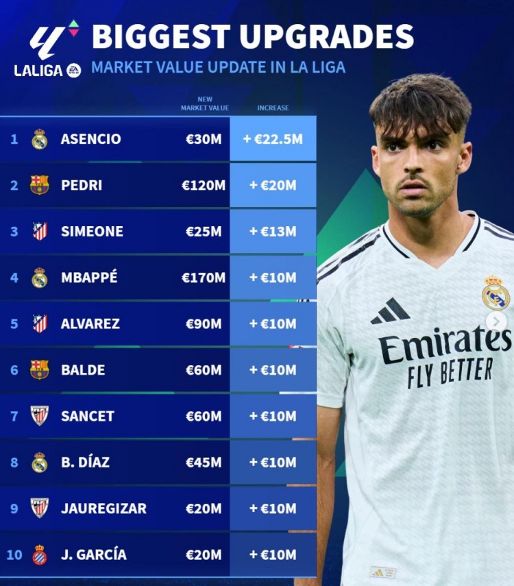 3月24日訊 《轉(zhuǎn)會(huì)市場》統(tǒng)計(jì)了西甲球員身價(jià)更新后的升值最多情況,勞爾-阿森西奧力壓佩德里居首。