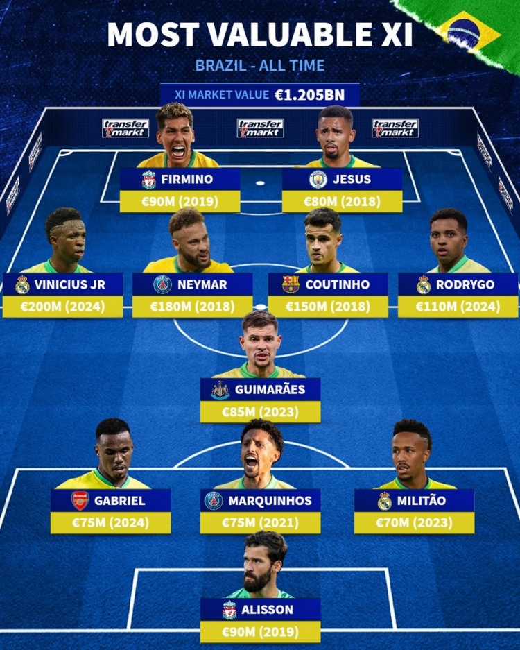 德轉(zhuǎn)列巴西歷史身價(jià)最高陣容