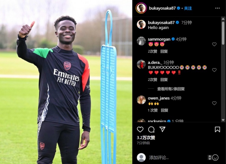 3月28日訊 阿森納邊鋒薩卡更新社媒,曬出自己身穿訓(xùn)練服照片,配文:又見面了。