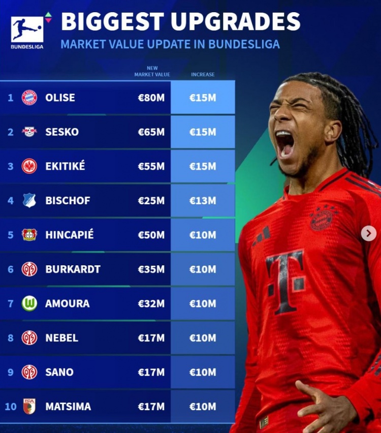 3月30日訊 《轉(zhuǎn)會市場》在此前更新了德甲球員身價,并列出了身價升值幅度最大情況,奧利塞等3人領(lǐng)銜。