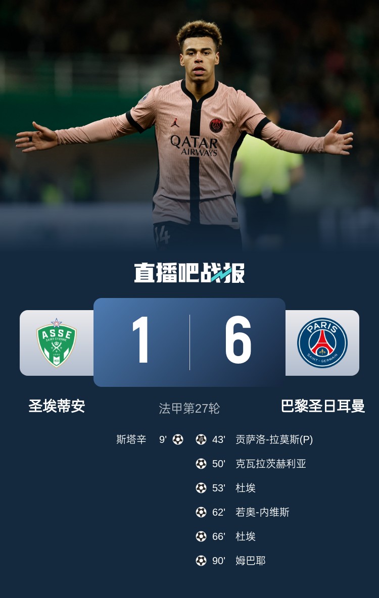 法甲第27輪,巴黎6-1大勝圣埃蒂安,暫以22分優(yōu)勢領(lǐng)跑。上半場,斯塔辛首開紀錄,貢薩洛-拉莫斯點射扳平;下半場,克瓦拉茨赫利亞擴大比分,內(nèi)維斯破門,杜埃梅開二度,姆巴耶打進一球。