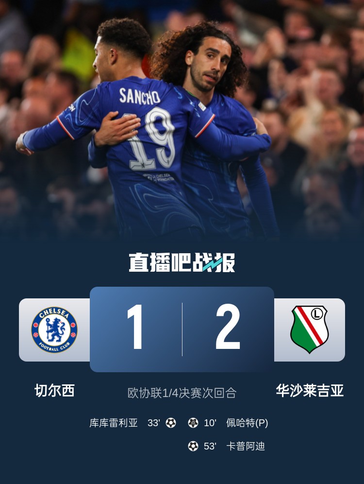 切爾西1-2不敵華沙萊吉亞,以兩回合總比分4-2淘汰對(duì)手,晉級(jí)歐協(xié)聯(lián)四強(qiáng)。