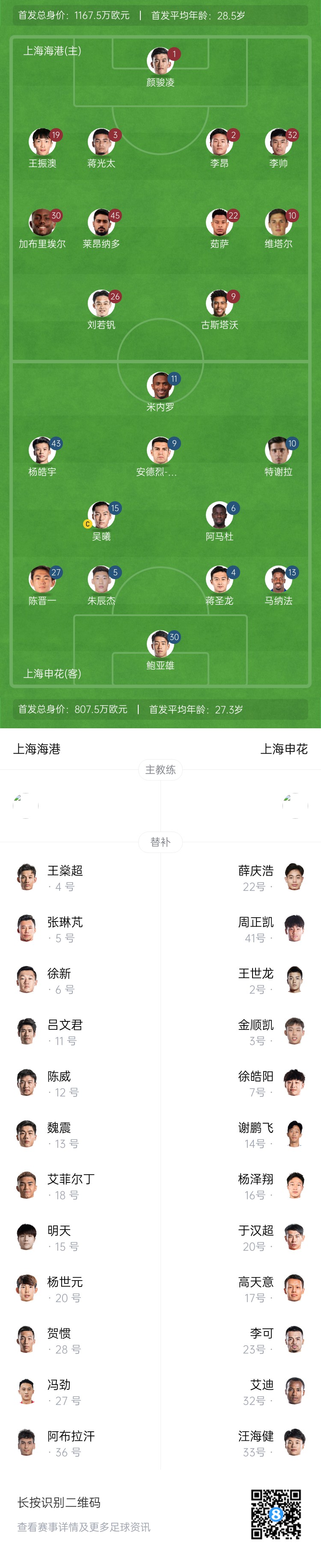 上海申花替補(bǔ):1-薛慶浩、41-周正凱、2-王世龍、3-金順凱、7-徐皓陽、14-謝鵬飛、16-楊澤翔、17-高天意、20-于漢超、23-李可、32-艾迪、33-汪海健
