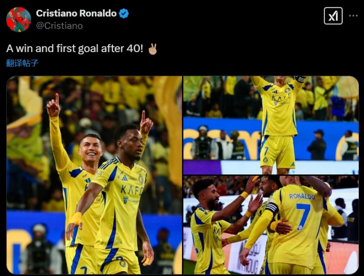 C羅也在賽后通過社媒曬出自己的慶祝照,并配文:“一場勝利,以及40歲后的第一粒進球?!?/p>