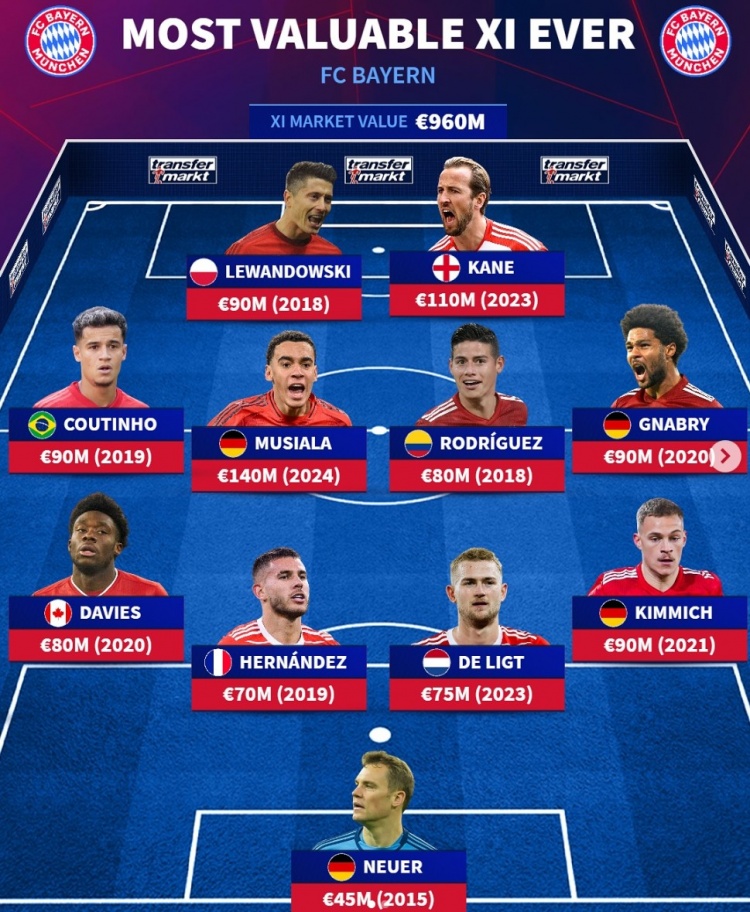 德轉(zhuǎn)列拜仁球員歷史身價最貴陣:總身價9.60億歐元