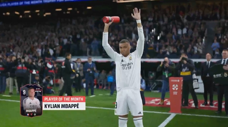 姆巴佩賽前展示西甲1月最佳球員獎杯,接受球迷歡呼