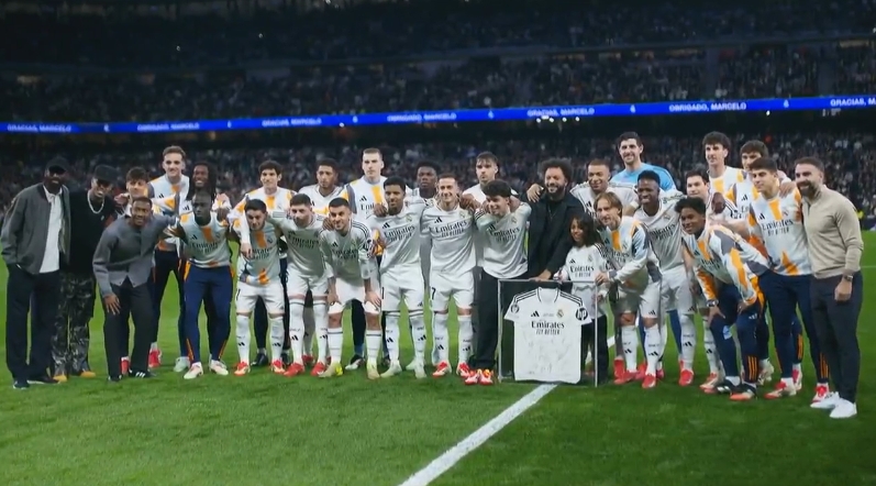 莫德里奇為馬塞洛送上紀念球衣,皇馬全隊和現(xiàn)場球迷為他送上掌聲。