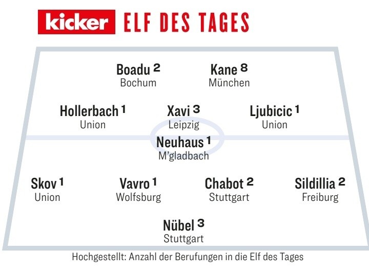 2月10日訊 德甲第21輪已經(jīng)完賽,《踢球者》評出了本輪德甲最佳陣容,凱恩領(lǐng)銜。