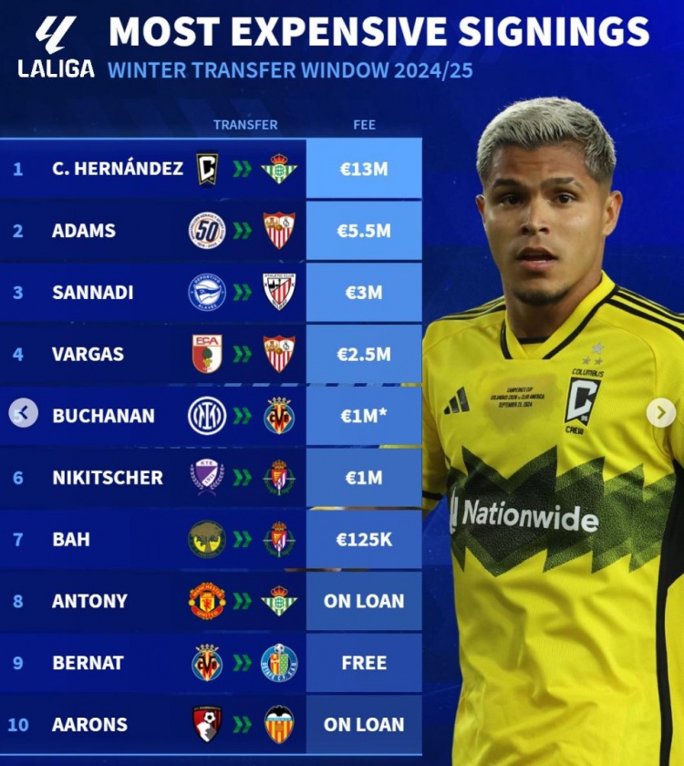5.布坎南,國(guó)米→比利亞雷亞爾,100萬(wàn)(租借費(fèi))
