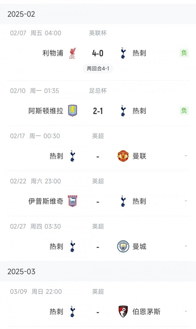 在此前進行的聯(lián)賽杯半決賽次回合比賽中,熱刺客場0-4落敗于利物浦,兩回合總比分1-4出局。