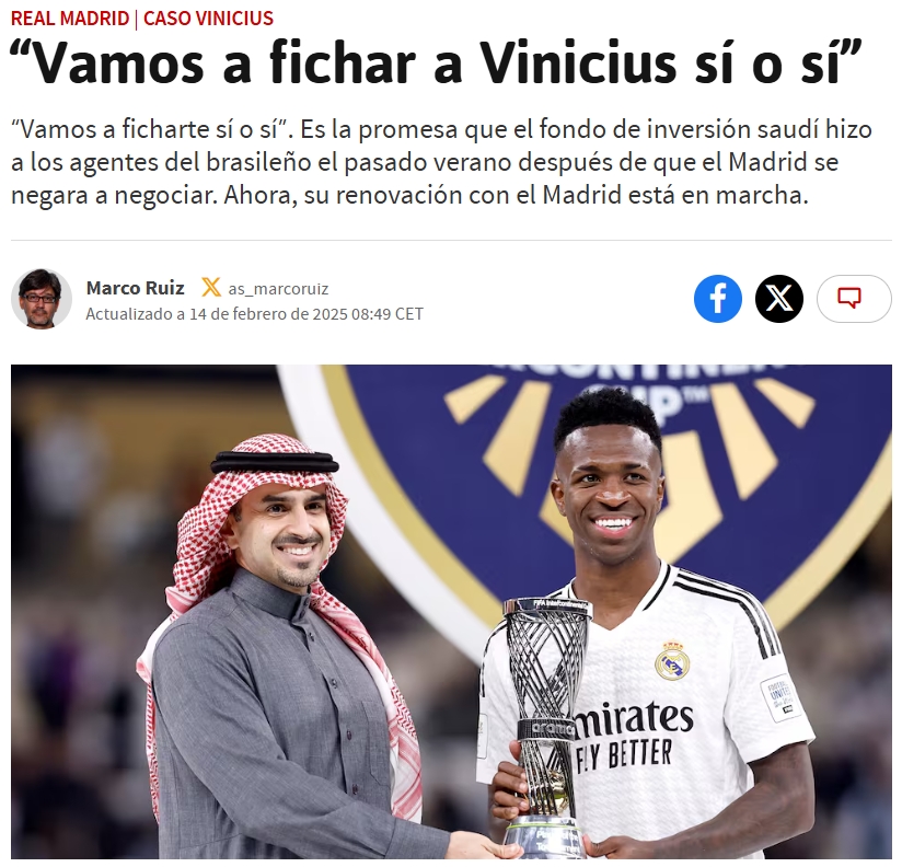 據(jù)悉,沙特方面的報(bào)價(jià)仍未正式發(fā)出,目前唯一擺在臺(tái)面上的就是他們的承諾,沙特人表示他們會(huì)在今夏為維尼修斯向開出一份約3億歐元的巨額報(bào)價(jià),并且堅(jiān)稱“無論如何我們會(huì)簽下他”(“Le ficharemos sí o sí”)。