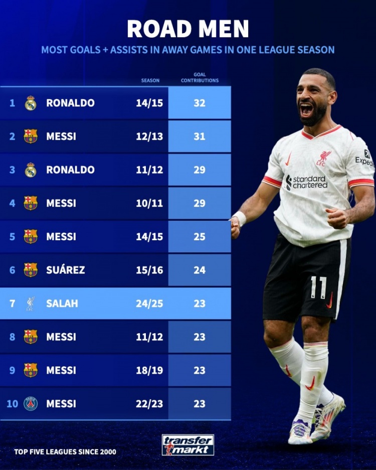 2月15日訊 德轉(zhuǎn)統(tǒng)計了2000年后在單賽季聯(lián)賽客場比賽中制造進(jìn)球榜單,本賽季的薩拉赫已經(jīng)制造了23球,距離C羅保持的紀(jì)錄還差9球。