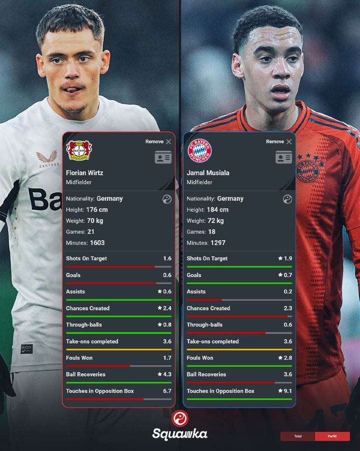 2月15日訊 勒沃庫(kù)森將在本輪德甲焦點(diǎn)戰(zhàn)迎戰(zhàn)拜仁,兩位德國(guó)帝星將正面對(duì)決。squawka也對(duì)比了兩人本賽季德甲關(guān)鍵數(shù)據(jù)情況。