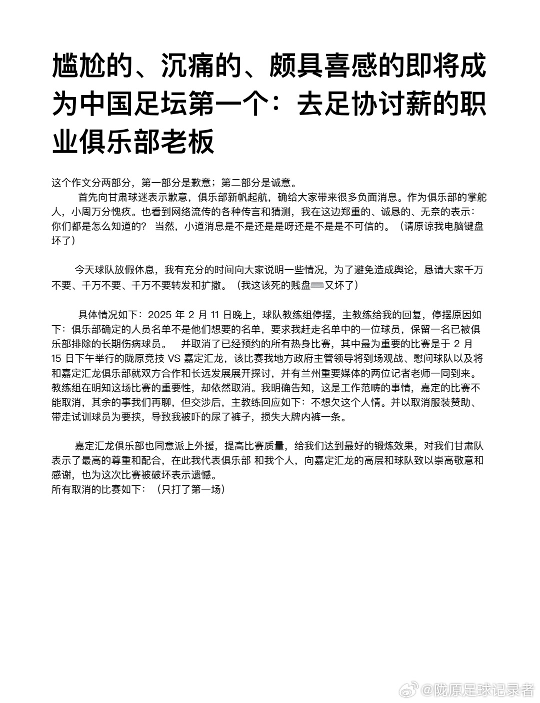 博主寫道:“蘭州隴原競技足球俱樂部遭遇內(nèi)部風波,教練組因投資人不同意引進一名長期處于傷病狀態(tài)的球員而集體停擺失聯(lián),熱身賽被取消,一季度預(yù)付的工資尚未退回?!边@種狗血的事情讓我們年輕的蘭州球隊遇到了,支持俱樂部周總維護自身和俱樂部的合法權(quán)益,抵制中國足球圈的糟爛人情世故亂象,呼吁那些不熱愛中國足球的沒有多少文化的酒蒙子,寄生蟲們滾出足球圈!