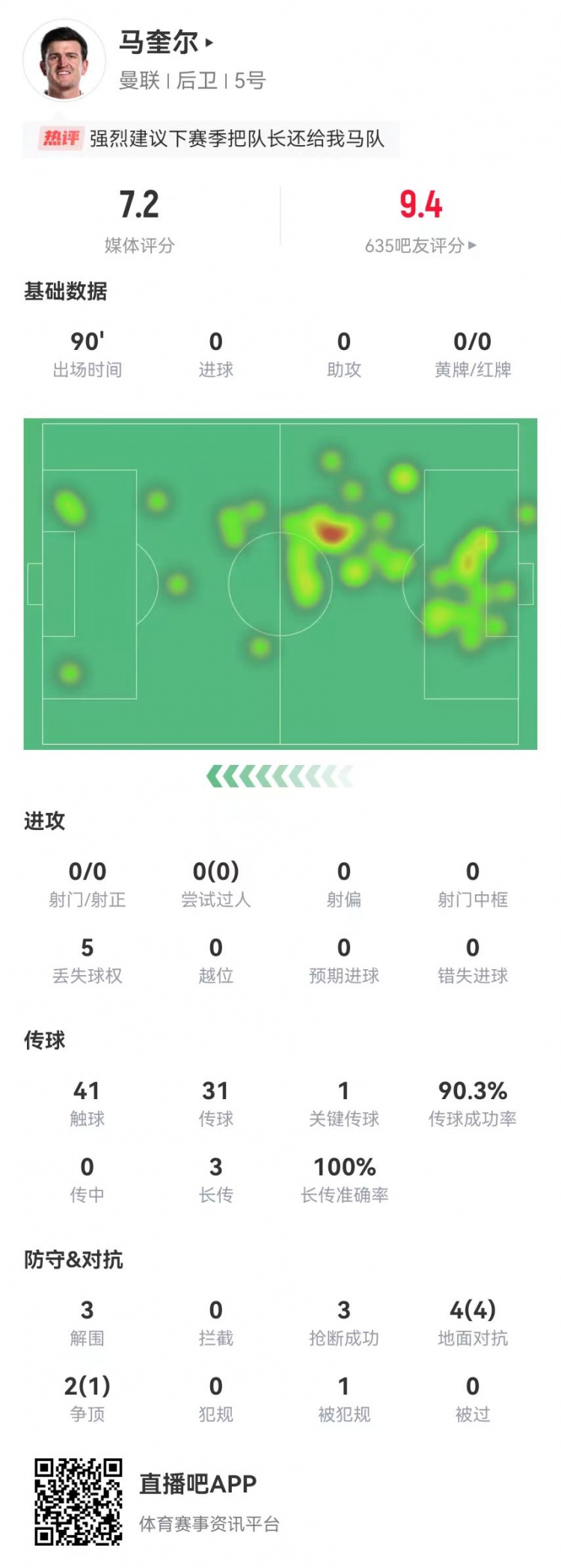 2月17日訊 曼聯(lián)在本輪英超0-1不敵熱刺,馬奎爾本場數(shù)據(jù)如下: